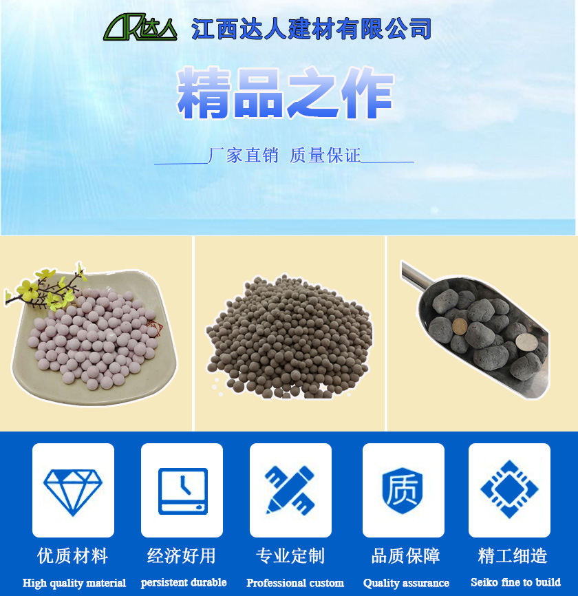 江西達人建材有限公司所生產(chǎn)的陶粒,按照其用途可以稱為水處理陶粒(陶粒濾料、污水處理廠專用陶粒)是一種新型的生物膜載體濾料,具有質(zhì)輕、比表面積大、吸附能力強等優(yōu)勢,廣泛用于各種形式的濾池濾罐。